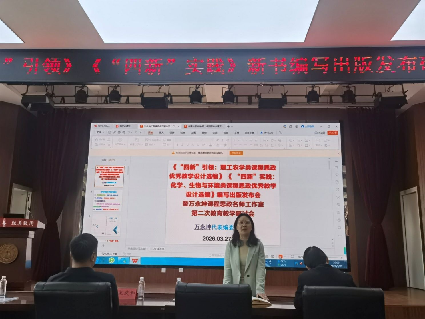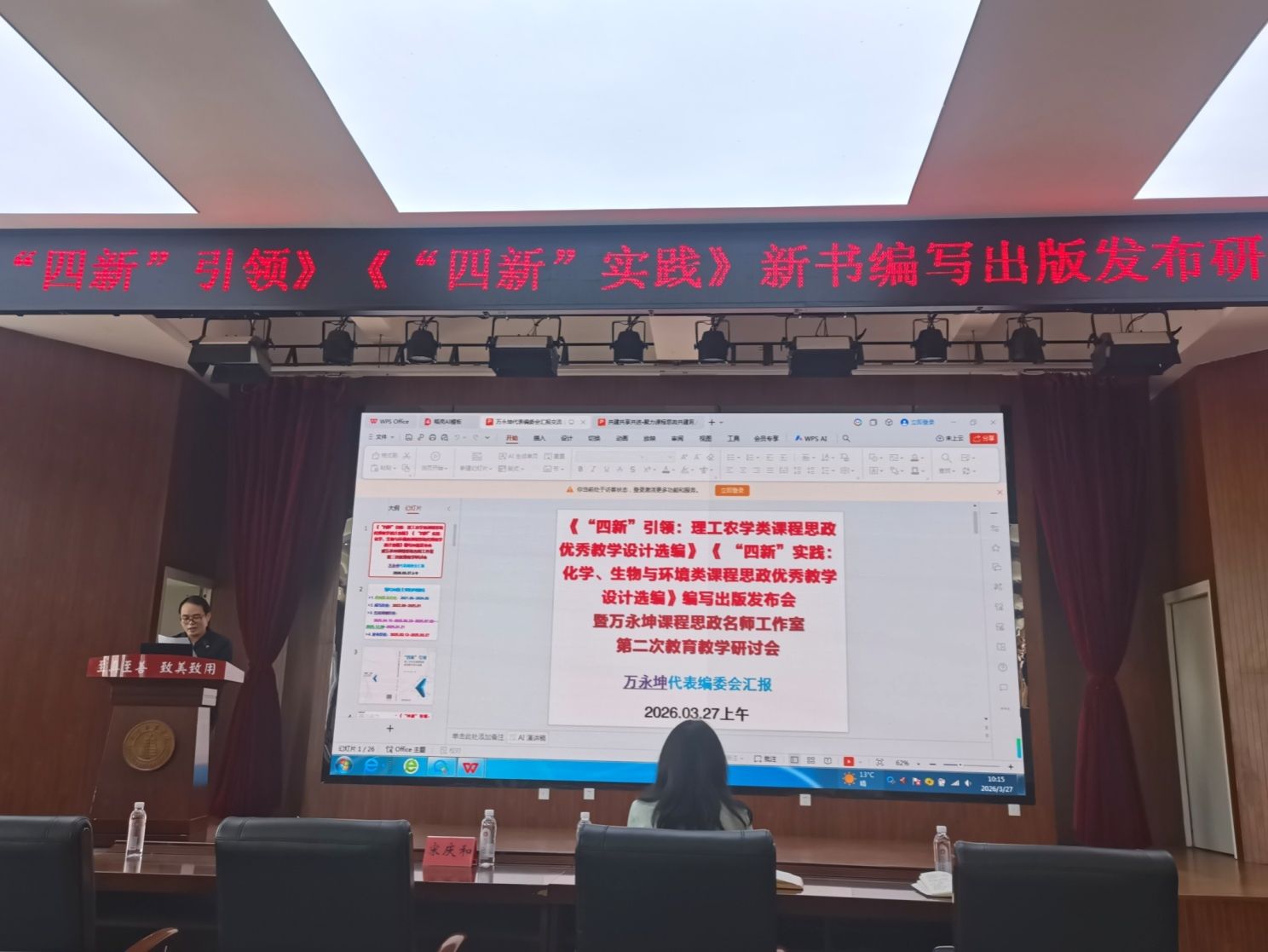 3月27日,《“四新”引领:理工农学类课程思政优秀教学设计选编》《“四新”实践:化学、生物与环境类课程思政优秀教学设计选编》编写出版发布会暨万永坤课程思政名师工作室第三次教育教学研讨会在大学生活动中心学生会堂举行。校党委副书记杨光,党委宣传部、教务处负责人,化学与环境工程学院、农学与生物科学学院等6个理工科学院教师代表共百余人参会。