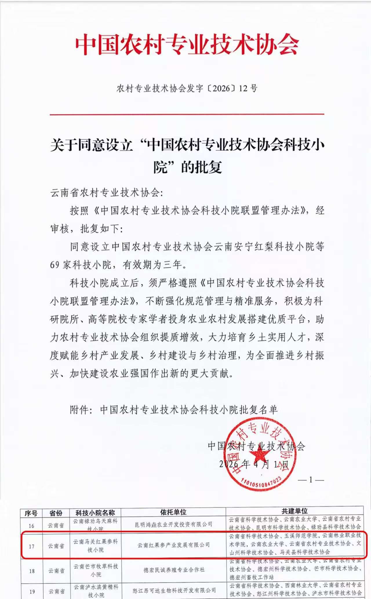 近日,中国农村专业技术协会发布《关于同意设立“中国农村专业技术协会科技小院”的批复》,玉溪师范学院牵头申报的“云南马关县红果参科技小院”正式获批设立。这是学校首次获批中国农技协科技小院。此次获批,标志着马关县红果参“一县一业”特色产业在产学研用一体化建设中取得重大突破,也是玉溪师范学院发挥高校科研优势、深度服务地方产业发展的重要成果。