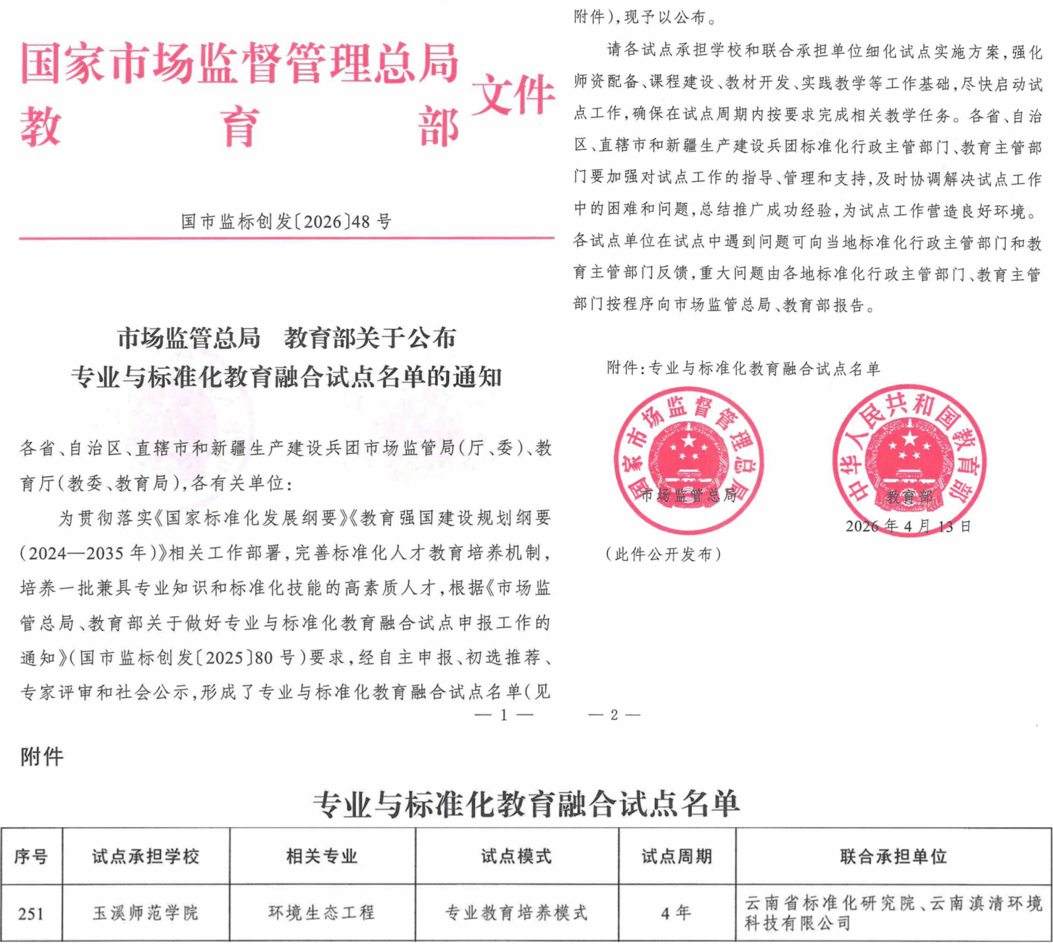 近日,国家市场监督管理总局、教育部联合印发《关于公布专业与标准化教育融合试点名单的通知》,全国共有253所高校的281个试点项目入选,云南省共有6所高校位列其中。玉溪师范学院与云南省标准化研究院、云南滇清环境科技有限公司联合申报的“环境生态工程专业教育培养模式”项目成功获批。