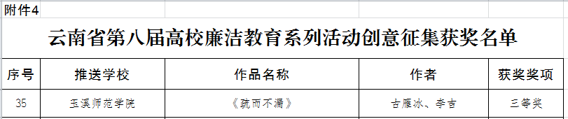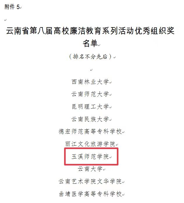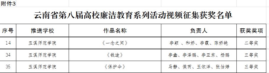 5月30日,由云南省委教育工委主办的“廉洁润初心 铸魂担使命”第八届高校廉洁教育系列活动获奖名单公布,玉溪师范学院荣获优秀组织奖。我校选送的师生作品在此次活动中喜获佳绩,荣获二等奖2项、三等奖3项。其中,文学院李静静的征文作品《璀璨人生》获二等奖,外国语学院李颖等同学的视频作品《一念之间》获二等奖,商学院李鑫等同学的视频作品《钱途》获三等奖,美术学院马静等师生的视频作品《保护伞》获三等奖,美术学院李吉等师生的设计作品《疏而不漏》获三等奖。