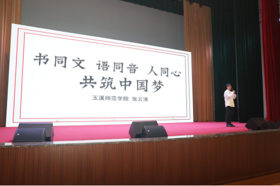 张云涛以《书同文 语同音 人同心 共筑中国梦》为题,立足云南省情,讲述了玉溪师范学院通过高质量推广国家通用语言文字助力乡村振兴和民族团结的故事。
