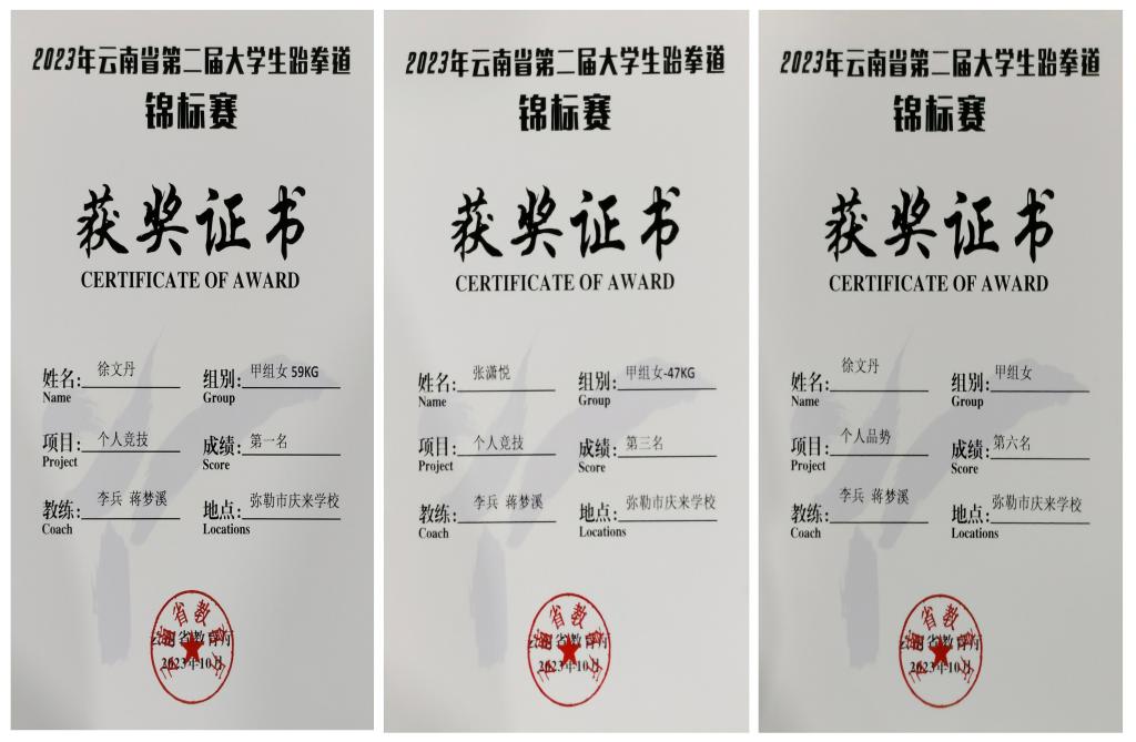 经过5天激烈角逐,我校运动员充分展现顽强拼搏、敢打敢拼的竞技精神,充分发扬礼义廉耻、忍耐克己、百折不屈的跆拳道精神,徐文丹(文学院)荣获女子个人竞技59公斤级金牌、个人品势第6名,张潇悦(教师教育学院)荣获女子个人竞技-47公斤级铜牌,李兵、蒋梦溪两位教师荣获“优秀教练”。