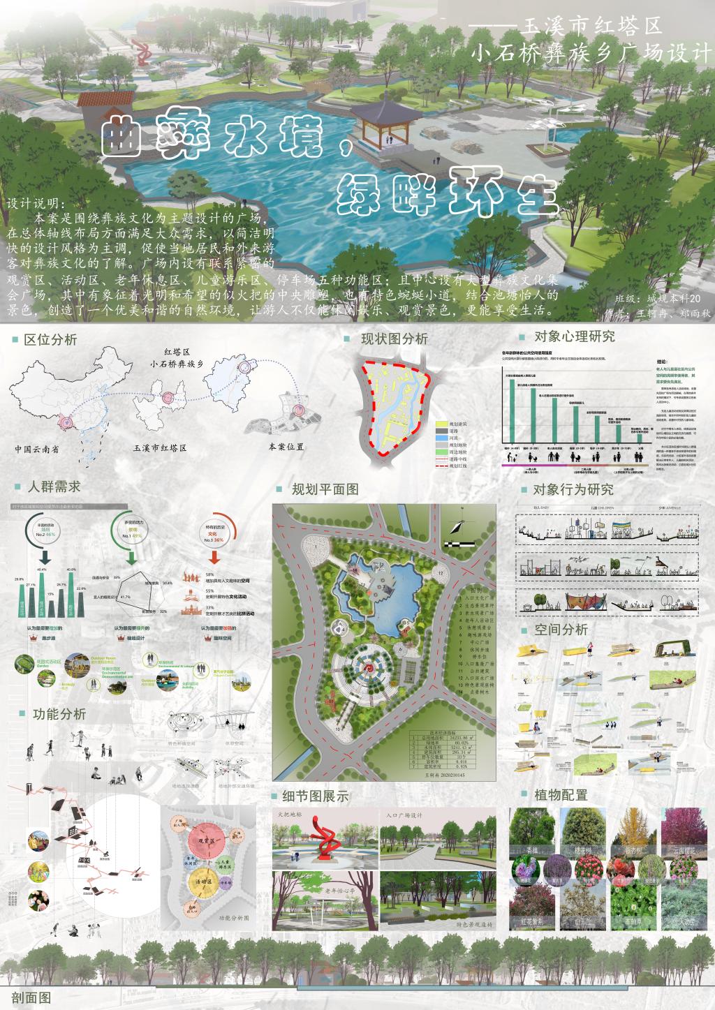 设计作品甲组一等奖《曲彝水境,绿畔环生——玉溪市红塔区小石桥彝族乡广场设计》(作者:王轲冉 指导教师:姚衍)