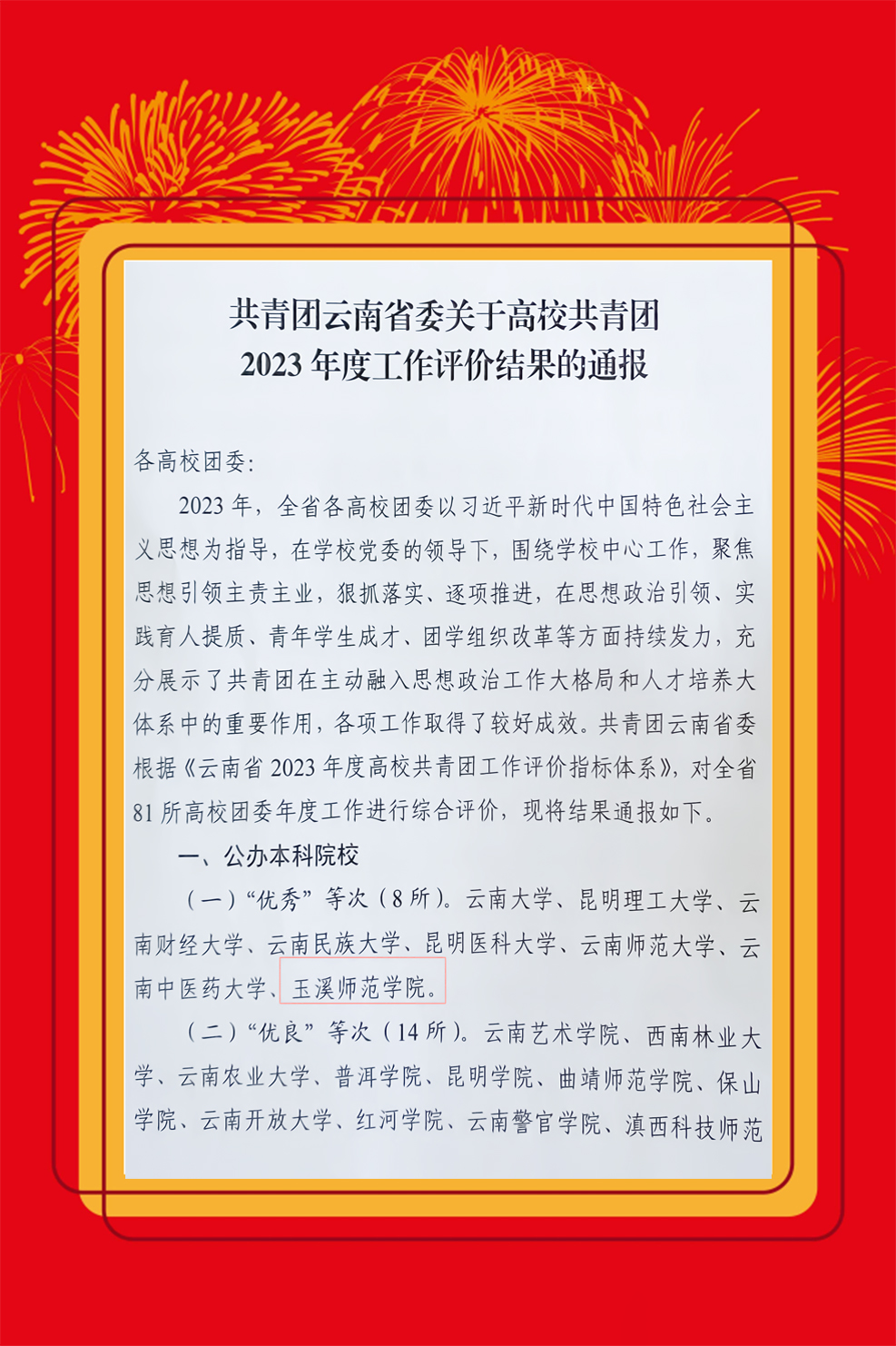 近日,共青团云南省委通报了全省高校共青团2023年度工作考核评价结果,玉溪师范学院共青团工作在全省24个公办本科院校中获评“优秀”等次,是获评“优秀”等次的唯一一家地州院校。