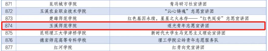 入选全国大学生志愿服务宣讲团既是对玉溪师范学院志愿服务能力和水平的充分认可,也是学校社会实践育人取得的又一突出成果。下一步,我校入选的3支宣讲团将严格按照团中央工作要求,聚焦“两弹一星”精神、井冈山精神和延安精神的深刻内涵和时代意义,制定宣讲计划,打磨宣讲内容,设计宣讲形式,扎实开展志愿宣讲,让红色基因世代相传,有效引导团员青年做有理想、敢担当、能吃苦、肯奋斗的新时代好青年。