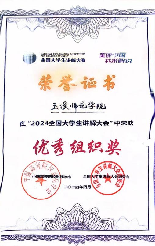 4月28日,2024“‘美丽中国·我来解说’全国大学生讲解比赛”决赛在山西大同举行。玉溪师范学院2023级泰国留学生马素瑛经过初赛、复赛层层选拔,最终获大赛特别奖。玉溪师范学院获优秀组织奖。