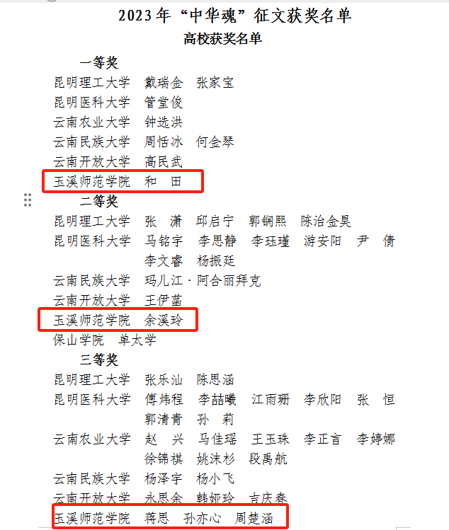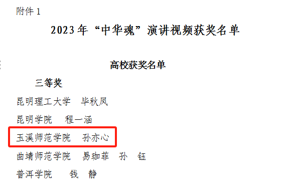 近日,云南省教育厅关心下一代工作委员会2023年“中华魂”(毛泽东伟大精神品格)主题教育读书活动评选结果公布,玉溪师范学院6项作品获奖。其中,征文一等奖1项、二等奖1项、三等奖3项,演讲视频三等奖1项。