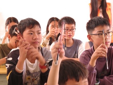 活动期间,服务队紧密围绕者湾村的独特文化符号,精心设计了“推普+文化浸润”教育关爱项目和红色研学活动。通过“诵、写、讲、传”四个维度,不仅为40名孩子提供了丰富的课程体验,还拓宽了文化传承和普通话推广的路径。孩子们在志愿者引导下,不仅学习了书法、楹联的基础知识,还通过京剧、茶艺、漆扇制作、太极、剪纸等传统非遗文化体验课程,深刻感受到了中华文化的博大精深。