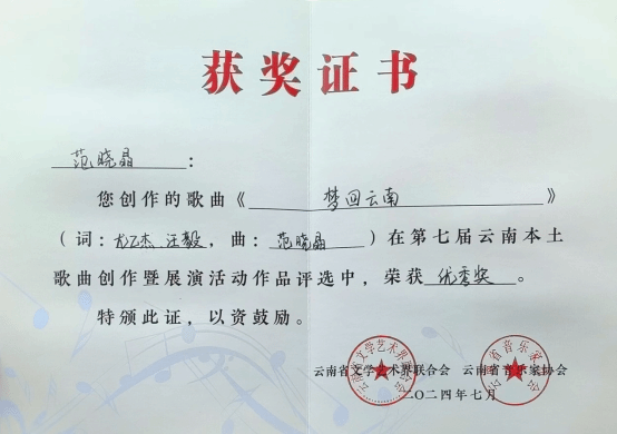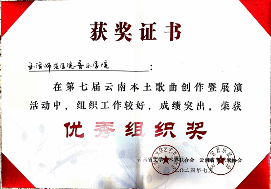 玉溪师范学院音乐学院获优秀组织奖,音乐学院教师蔡威、张建生、范晓晶在新创作品类比赛中分获一等奖、二等奖、优秀奖。