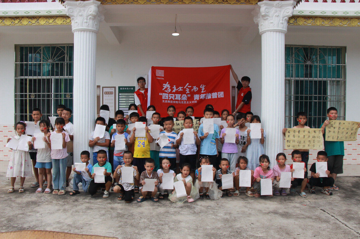 在马关县金厂镇中心学校,实践团成员与43名苗族瑶族孩子共上一堂课、共唱一首歌、共传一份情,带领孩子们在中越边境线上升国旗、唱国歌、共读《聂耳日记》。勐腊县勐满镇实践团在中老边境勐满镇曼烈村组织开展了以“国歌唱响国境线,聂耳故事润童心”为主题的爱国主义教育课堂,并为界碑描红、唱响国歌。沧源县勐董镇实践团在中缅边境抵边村向佤族孩子们讲述了聂耳与故乡玉溪、与母亲的感人故事,将聂耳母亲为聂耳种下的“音乐、勤奋学习、善良”三粒种子撒在孩子们的心田。