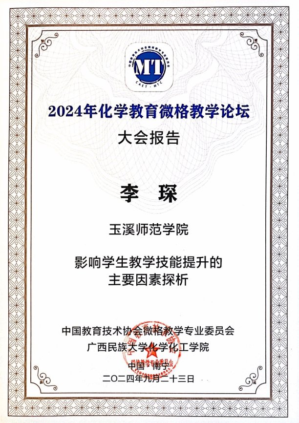玉溪师范学院化学生物与环境学院共选派6名学生参赛并全部获奖。其中,刘钰相、蒋春怡获一等奖,周雪、王敏、周亚萍获二等奖,王鑫获三等奖,充分展示了我校学生的风采。