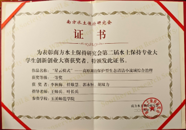 10月27日,南方水土保持研究会第二届水土保持专业大学生创新创业大赛颁奖仪式在重庆西南大学举行,玉溪师范学院化学生物与环境学院赵敏慧老师带队,王帅兵、叶长兵老师指导,李秋梅、任敬慧、郭永恒、胡双力同学共同完成的参赛作品《“星云模式”——高原湖泊保护型生态清洁小流域综合治理》荣获本科生组一等奖。