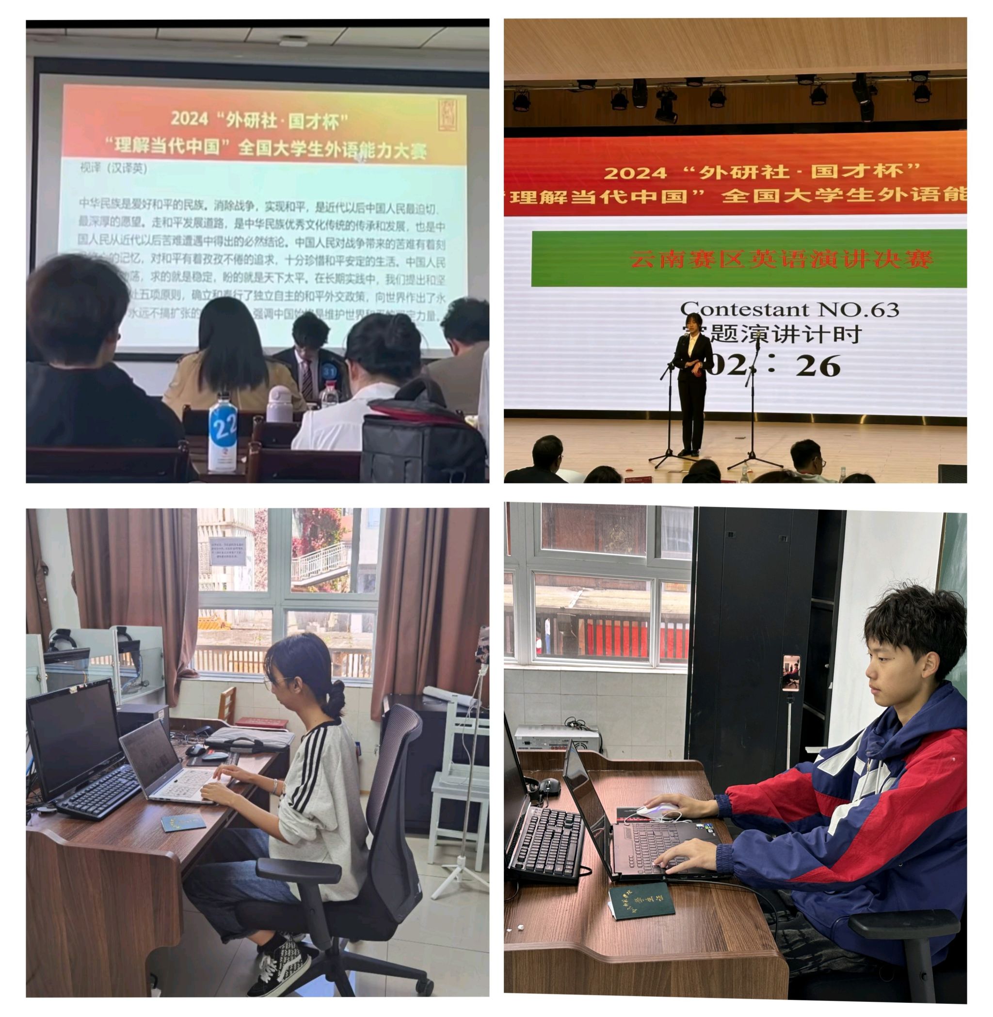 英语综合能力、笔译、日语、泰语的省级复赛以线上比赛的形式进行,英语口译、英语演讲云南省复赛分别在云南大学、西南林业大学举行。玉溪师范学院学子在比赛中沉着冷静,展示了扎实的外语基础和良好的综合运用能力。