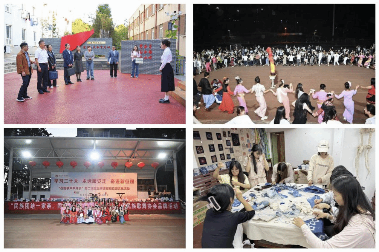 坚持文化浸润。将铸牢中华民族共同体意识教育融入第二课堂,组织3500余名2024级新生到聂耳和国歌爱国主义教育基地开展研学活动。组织“青马”学员到玉溪市江川区民族团结进步教育基地暨铸牢中华民族共同体意识宣传教育基地——江城镇唐淮源烈士纪念馆和安化彝族乡民族文化传习馆开展研学活动。沿着习近平总书记的足迹,组织团学骨干赴腾冲司莫拉佤族村开展实践教学活动,深切感受各民族交往交流交融的生动情景。持续开展“传统体育进校园,民族团结向未来”活动,通过竹竿舞、烟盒舞比赛,传承中华优秀传统文化。此外,各学院着眼中华优秀传统文化传承,开展云南民族文化拼图比赛、“四季足迹”非遗手工设计比赛、“盛世国风—礼乐华夏”文化体验等丰富多彩的校园文化活动50余次,覆盖学生3500余人次。
