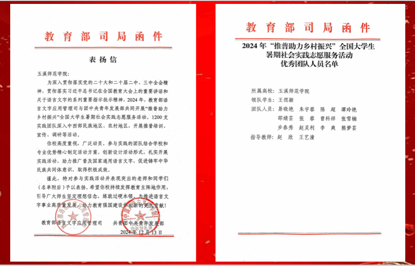 近日,教育部语言文字应用管理司联合共青团中央青年发展部发来表扬信,向玉溪师范学院参与2024年“推普助力乡村振兴”全国大学生暑期社会实践志愿服务活动的老师和同学予以表扬,文学院“语通八方·籽籽同心”推普实践团入选优秀团队。