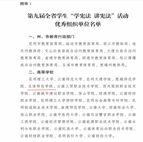 近日,云南省教育厅发文通报第九届全省学生“学宪法 讲宪法”活动开展情况,玉溪师范学院获“优秀组织单位”荣誉称号;由法学院朱艳英老师指导的栗国梁同学代表学校参加青少年学生“学宪法 讲宪法”演讲比赛获二等奖,冶联凤老师指导的武昕颖同学代表学校参加青少年学生“学宪法 讲宪法”素养竞赛获“优秀奖”。