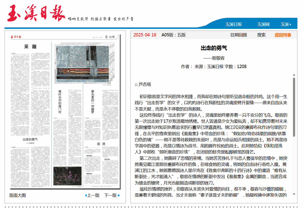 最后的叛逃来临时,死亡成了最精妙的同谋。心电图渐平的曲线里,我听见“恶之花”在静脉中绽放:“自由是永不愈合的伤口,却从中迸发‘恶之花’的芬芳。”若你细听她留给世界的韵脚,你会听见永恒的海浪正冲刷着断锁,听见赤足奔跑在沙滩的闷响,听见敬容在《逻辑病者的春天》中的低语:“所有的痛苦串成项链/挂在世纪的颈项”。那才是她留给世界的真正遗嘱:自由从来不是目的地,而是不断碾碎旧壳时爆裂的脆响。