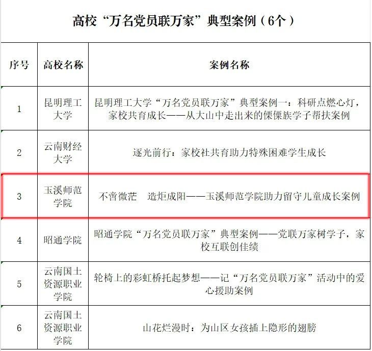为深入贯彻落实党的二十大精神,全面实施“时代新人铸魂工程”,贯彻落实教育部等十七部门印发的《全面加强和改进新时代学生心理健康工作专项行动计划 (2023—2025 年)》和《云南省全面加强和改进新时代学生心理健康工作专项行动实施方案》,中共云南省委教育工委、云南省教育厅组织开展大中小学“万名党员联万家”活动,落实立德树人根本任务,涌现一批典型案例,其中,有各州市教育体育局优秀典型案例8个、高校典型案例6个。