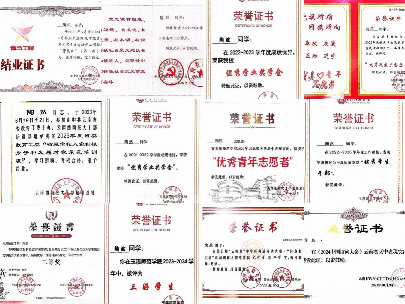 花外春来路,芳草不曾遮。陶然的成长轨迹恰似一簇穿透晨雾的萤火,在典籍的星辉与乡野的晨露间翩跹,以文字为犁,耕云播雨。图书馆的孤灯长夜,推普路上的泥泞足迹,宣讲台上迸溅的思想星火,都化作她穿越荣誉花海时不灭的航标。于她,“师范生”三个字是深扎红土地的根系,亦是托举新芽的叶脉——当二十四节气歌在滇中村落回响,当铸牢中华民族共同体意识的信念随笔墨流淌,这条春深之路终将延伸成千万条通往文化原乡的阡陌。让我们以陶然为榜样,以勤学为锄,以热忱为种,在时代沃野上耕耘,用青春的汗水浇灌属于自己的成功之花。