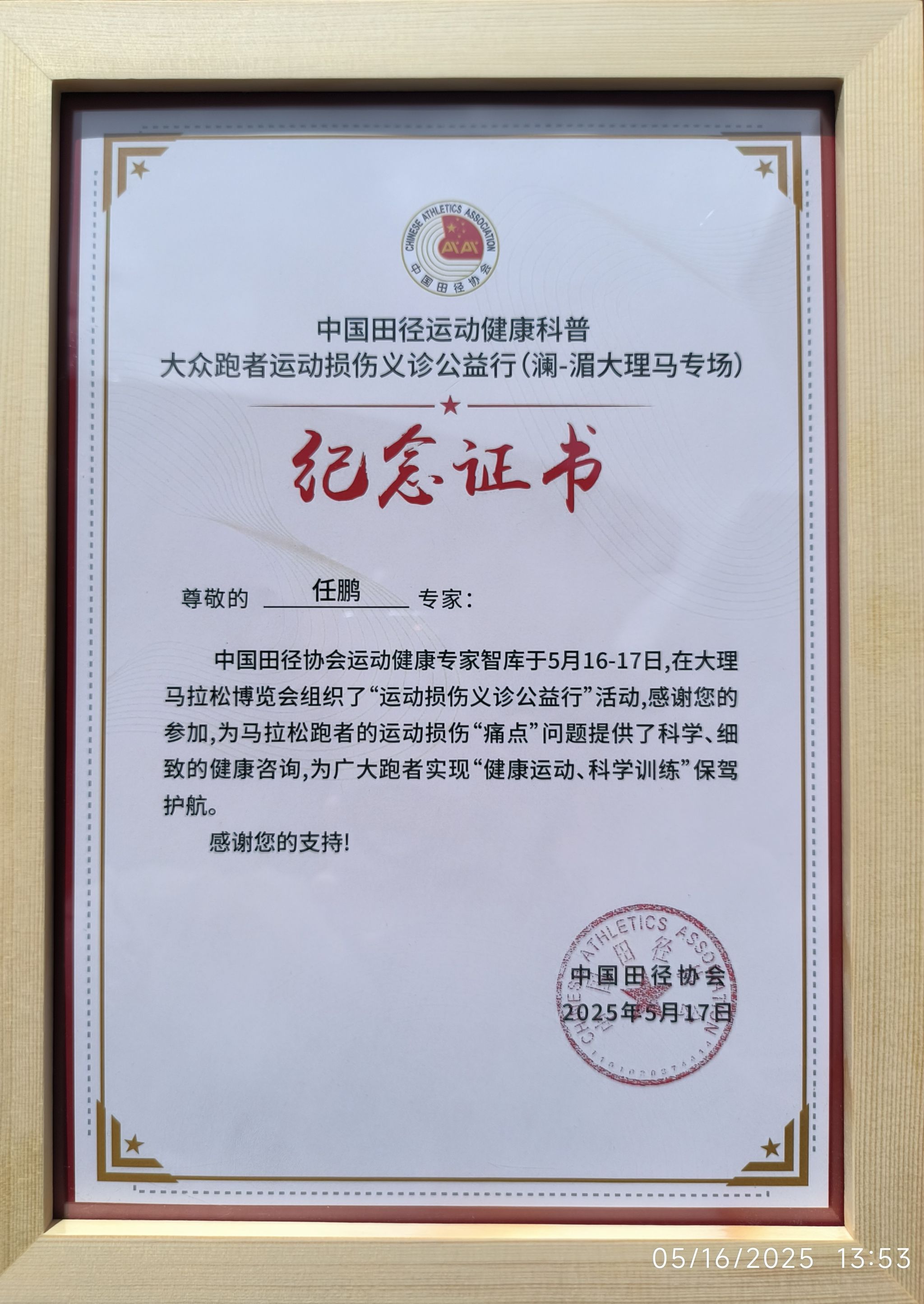 5月16日至17日,任鹏博士带领我校运动康复、体育教育专业学生参加中国田径协会在云南大理举办的“2025中国田径运动健康科普大众跑者运动损伤义诊公益行”活动。