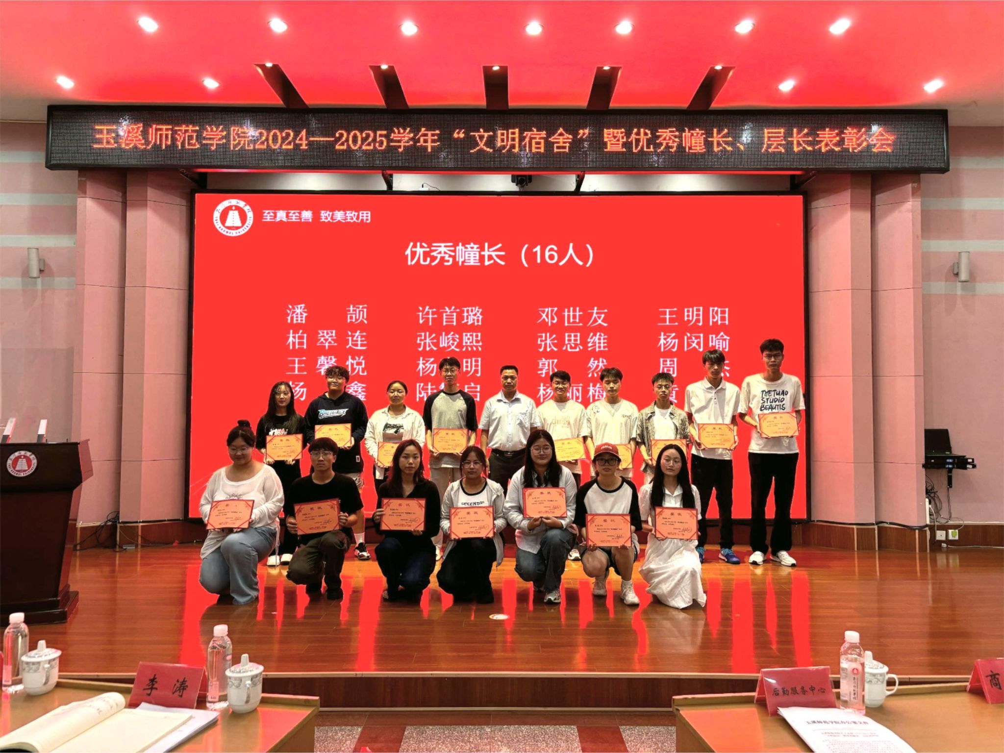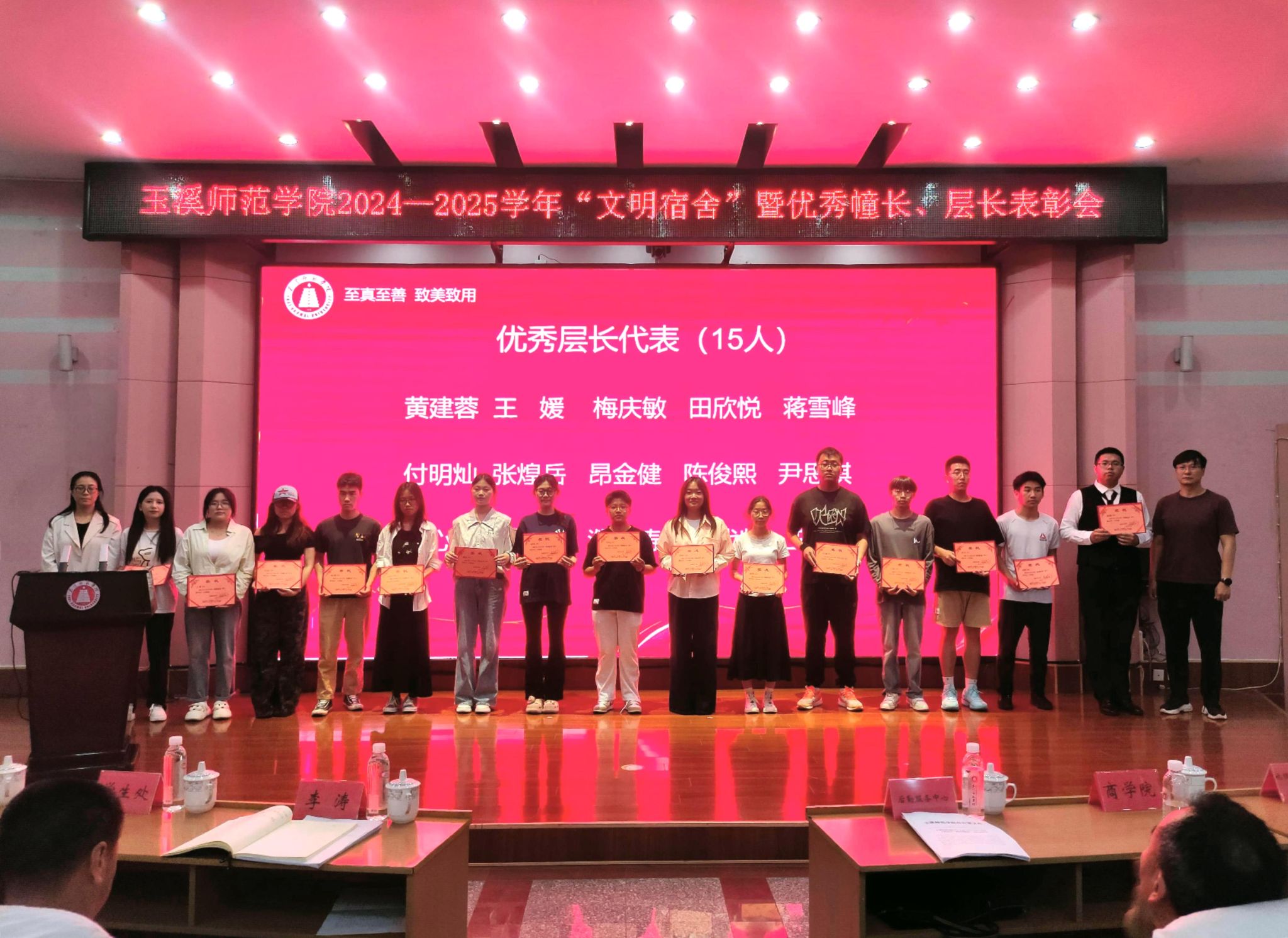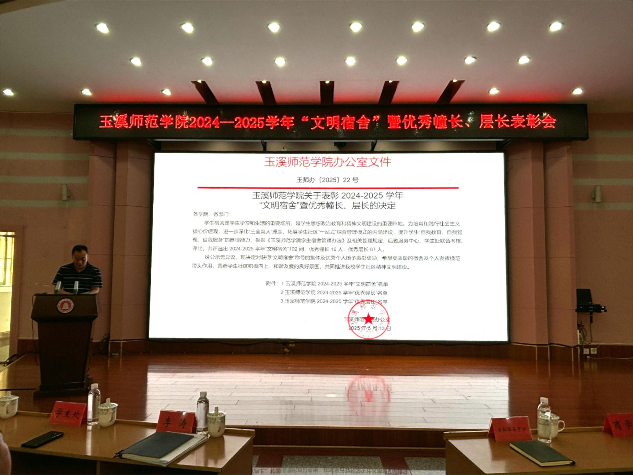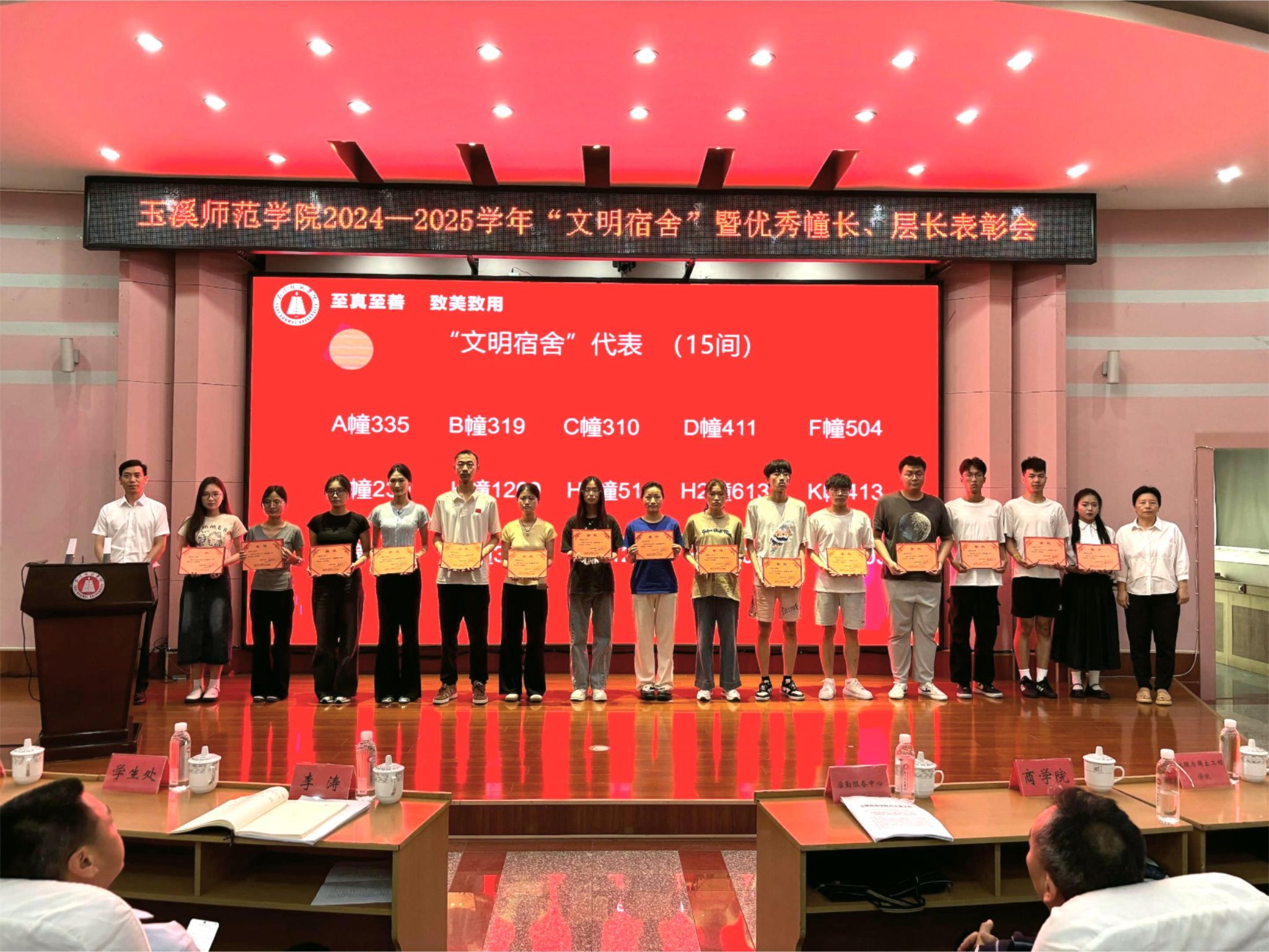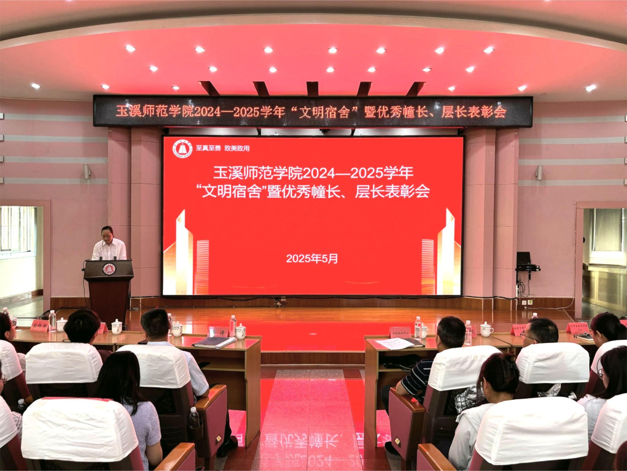 5月21日下午,玉溪师范学院2024—2025学年“文明宿舍”暨优秀幢长、层长表彰会在科学讲堂隆重举行。学校党委委员、副校长李涛,宣传部、学生处、团委相关领导,各学院党委副书记、辅导员、学生代表,受表彰宿舍及个人代表,后勤服务中心以及保安公司相关人员参加表彰会。
