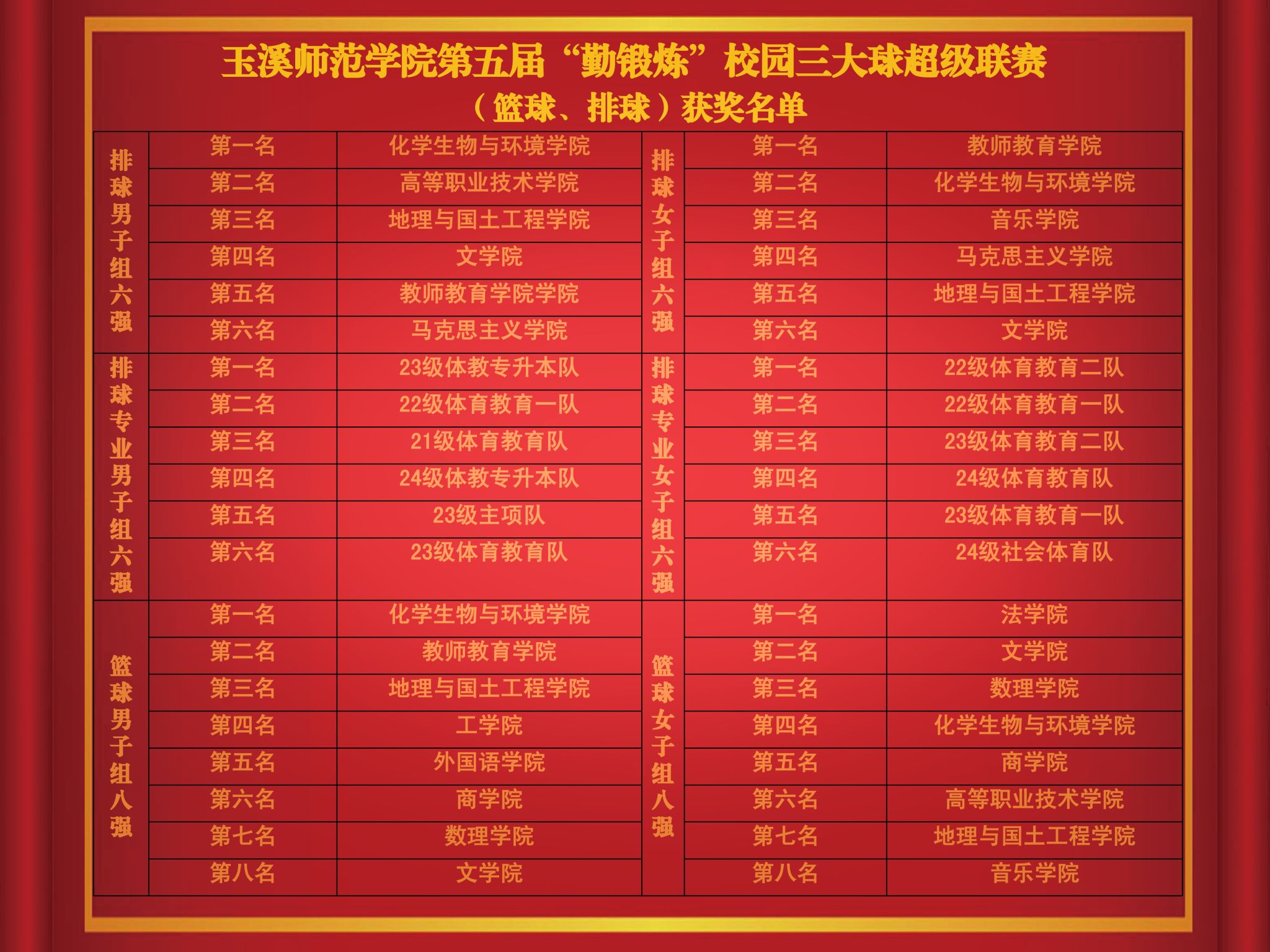 经过激烈角逐,化学生物与环境学院荣获排球男子组、篮球男子组冠军,教师教育学院荣获排球女子组冠军,法学院荣获篮球女子组冠军;2023级体教专升本队荣获排球专业男子组冠军,2022级体育教育二队荣获排球专业女子组冠军。