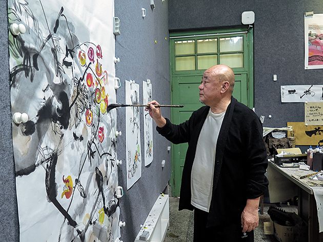 张汉东刚开始画石榴的时候,脑子里有很多想法。想尝试二三十种绘画方式,通过浓墨、淡墨、焦墨,以及曲线、直线、短线、长线等不同形态的线条去描绘石榴。这其实是在版画和油画的基础上,运用水墨方式进行创作,色彩鲜艳且富有装饰感。“经过多年油画、版画、水粉、水彩的训练,我有了更多方法可以尝试,于是就有了用鲜艳色彩画石榴的方法。这种画法除了色彩创新外,画出像藤条一样的树枝也是关键,因为它兼具书法性和书写性。我画画时感觉像在写字,通过控制虚实、浓淡、疏密和空间变化,知道哪里该留白、哪里该多画,以此符合大众的审美共性标准。”他说。