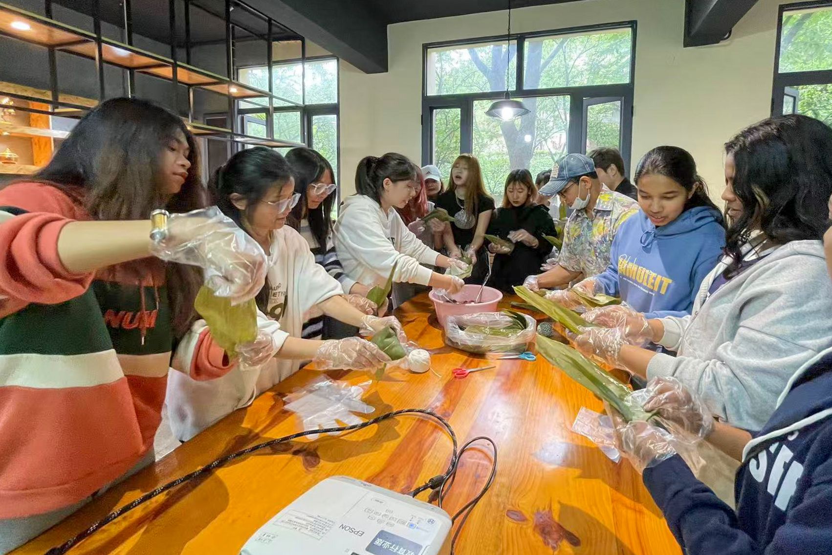 在中国师生的现场指导下,留学生们开始兴致勃勃地学习包粽子。在体验民俗文化的同时,留学生们也收获了自己的劳动成果。在品尝香甜可口的粽子时,留学生们也在交流互动中共同领略到了中华文化的独特魅力。