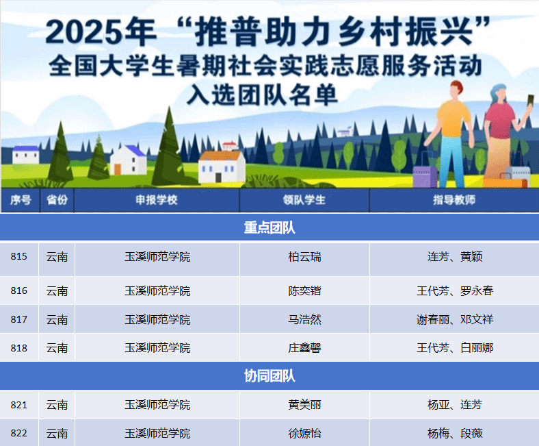 7月3日,2025年“推普助力乡村振兴”全国大学生暑期社会实践志愿服务活动入选团队名单正式发布。玉溪师范学院6支团队在全国1680所高校的8013支团队中脱颖而出,其中4支团队入选重点团队、2支团队入选协同团队。