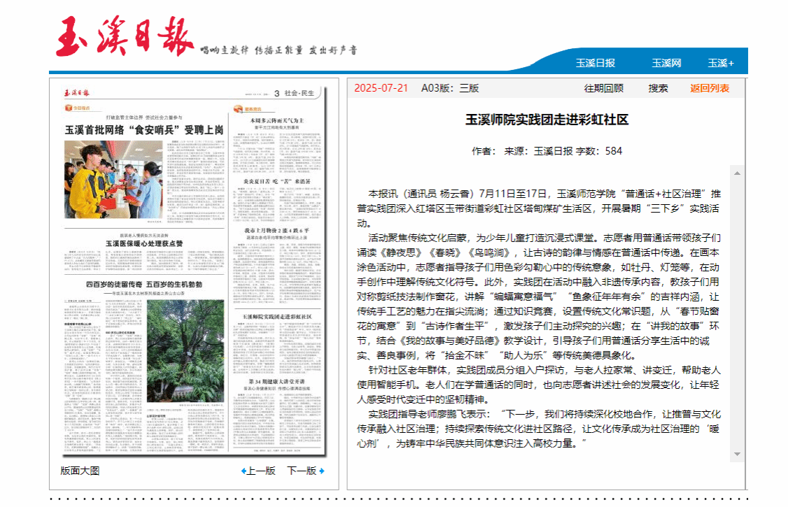 本报讯(通讯员 杨云香)7月11日至17日,玉溪师范学院“普通话+社区治理”推普实践团深入红塔区玉带街道彩虹社区塔甸煤矿生活区,开展暑期“三下乡”实践活动。