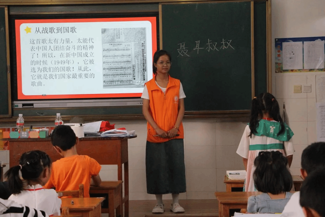 实践伊始,推普团赴腾冲滇西抗战纪念馆、国殇墓园等地,深入学习地方革命历史,汲取红色养分。带着这份厚重的历史积淀,团队在东营村精心打造了系列沉浸式红色教育活动:“童声话英烈”故事会让孩子们在讲述中铭记历史,“诗韵颂山河”朗诵课以铿锵之声抒发爱国豪情,“画笔绘忠魂”创作坊描绘出跨越时空的英雄形象,“国歌诞生记”主题宣讲深化了村民的爱国情怀,“红歌飞边寨”活动让激昂的旋律响彻村寨。团队巧妙地将普通话教学融入各项活动全过程,使红色课堂同时成为生动的语言实践场,让家国情怀与标准语言表达在青少年心中深度融合。