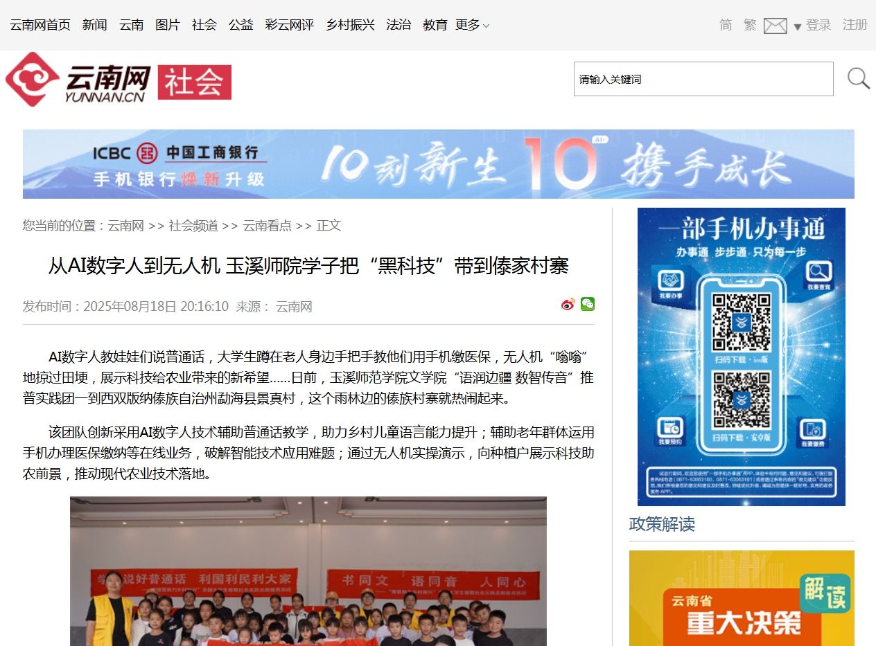 作为地方应用型高校,玉溪师范学院扎根玉溪,聚焦云南及东南亚地区,培养服务地方基础教育与经济社会发展的专业人才。学校将科技下乡与推普工作纳入“服务云南乡村振兴”整体布局,明确新闻人才“扎根田野、服务基层”的培养方向,把暑期“三下乡”社会实践作为重要教学环节,通过政策引导融入第一、第二课堂,让人才培养与乡村需求紧密对接。为保障成效,学校鼓励各学院结合专业特色开展活动,新闻专业聚焦“科技+传播”,引导学生体会“新闻传播如何融入乡村肌理”。