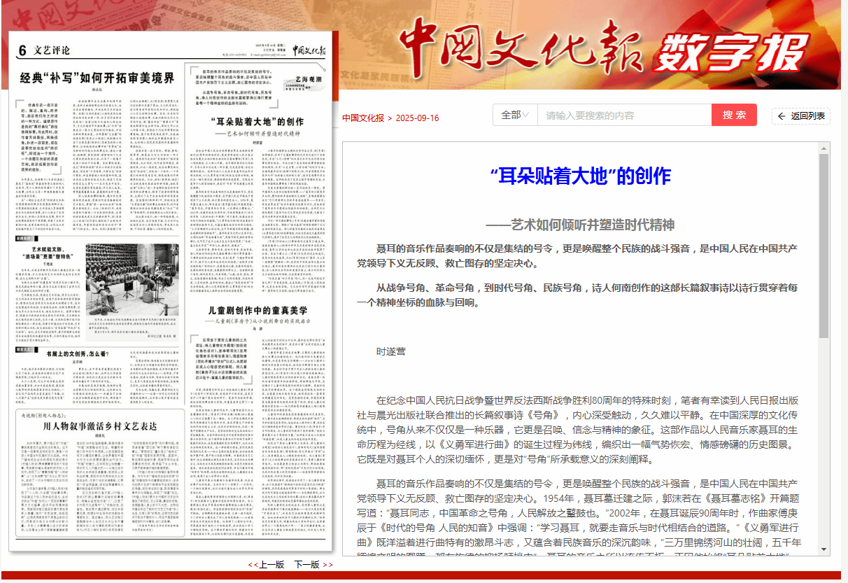 9月16日,《中国文化报》文艺评论版发表我校教师时遂营教授的文章:“耳朵贴着大地”的创作——艺术如何倾听并塑造时代精神,现转载原文,以飨读者。