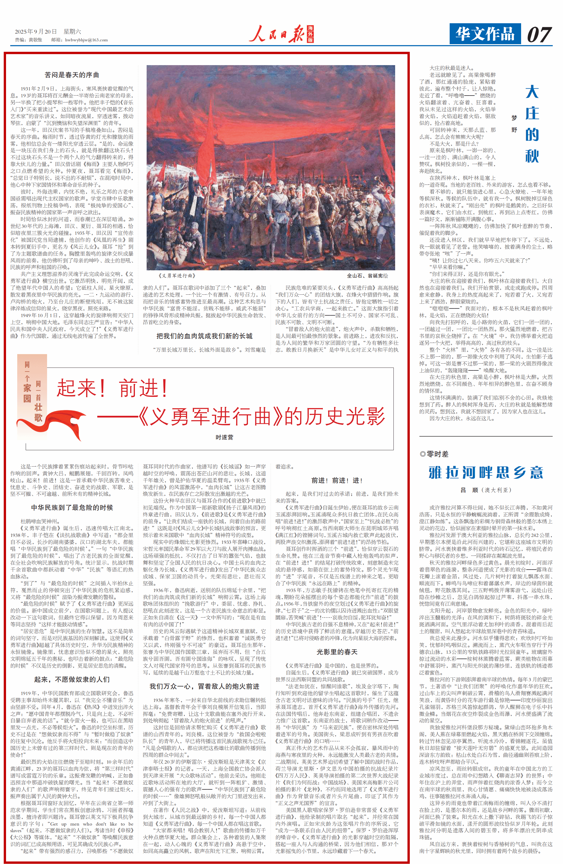 “法老如犹在,惊醒问谁歌”,埃及金字塔下,陶行知听到欢迎他的留学生唱起这首歌时,催生了这蕴含古老文明对话意味的诗句。“民族的号手”任光,继承聂耳遗志,首开《义勇军进行曲》海外传播的先河。在法国传唱后,他奔赴东南亚,组建合唱团,不遗余力推广这首歌。东南亚的战士,将歌词稍作改动——易“中华民族”为“马来亚民族”,便在密林深处传唱着进军的号角。美国街头,梁思成听到有男孩在吹着《义勇军进行曲》的口哨……