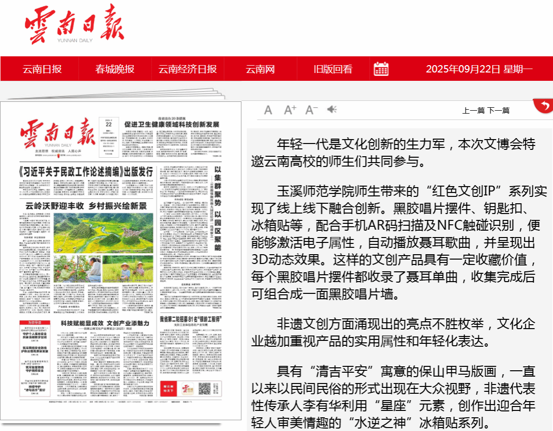 9月17日至21日,为期五天的创意云南文化产业博览会(2025)在昆明滇池国际会展中心举行。玉溪师范学院师生文创产品亮相创意云南文化产业博览会。据云南日报消息,玉溪师范学院师生带来的“红色文创IP”系列实现了线上线下融合创新。黑胶唱片摆件、钥匙扣、冰箱贴等,配合手机AR码扫描及NFC触碰识别,便能够激活电子属性,自动播放聂耳歌曲,并呈现出3D动态效果。这样的文创产品具有一定收藏价值,每个黑胶唱片摆件都收录了聂耳单曲,收集完成后可组合成一面黑胶唱片墙。