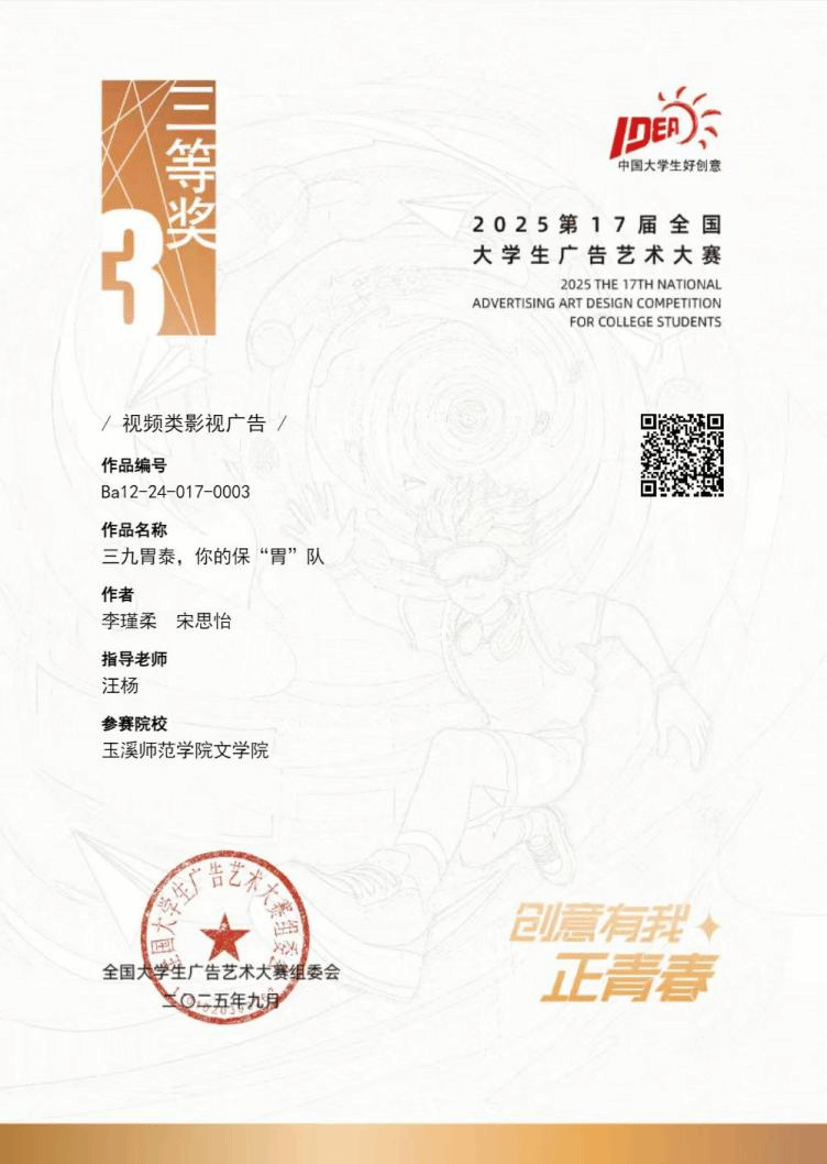 近日,第十七届全国大学生广告艺术大赛(简称“大广赛”)全国总评审结果揭晓。玉溪师范学院文学院汪杨老师指导的新闻学专业学子在比赛中表现突出,共斩获国家级三等奖1项、省级三等奖1项、省级优秀奖4项,展现出扎实的专业素养与创新能力。