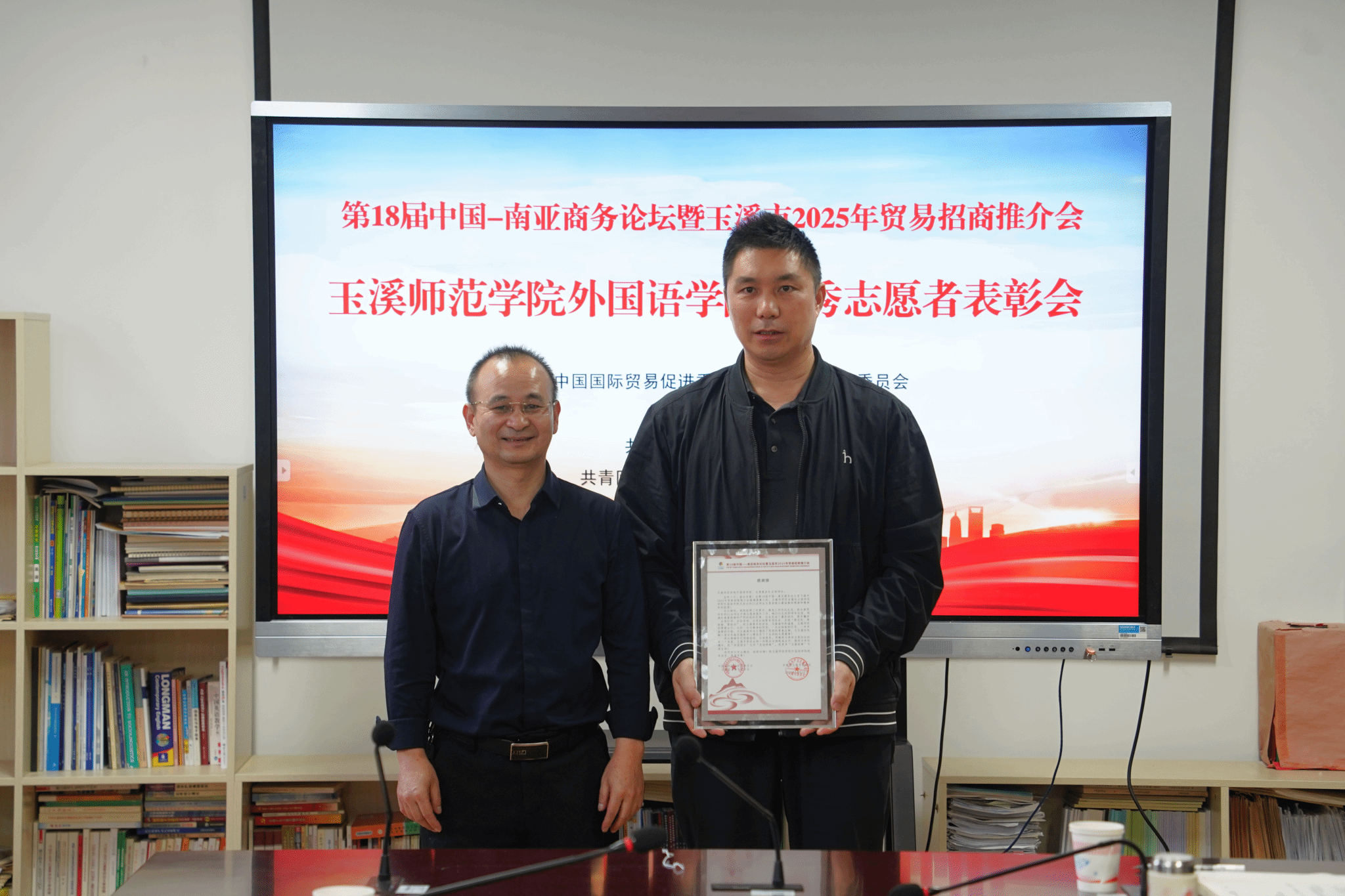 10月30日,玉溪市贸促会与团市委一行专程来到外国语学院,表彰在第18届中国—南亚商务论坛中表现优异的玉师学子。玉溪市贸促会会长郭金平代表主办方,向外国语学院递交感谢信并为21名优秀志愿者颁发荣誉证书。