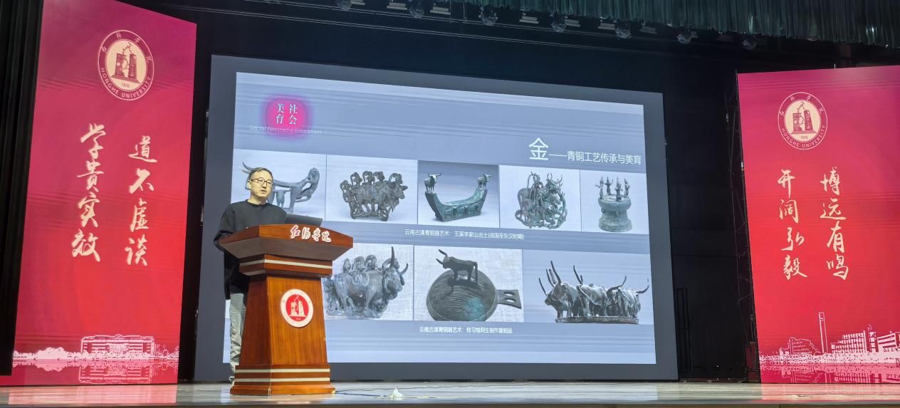 湄公河次区域民族民间文化传习馆馆长王飚教授围绕美育主题,专题分享了边疆民族地区高校如何构建以“交往交流交融”为特色的美育教学体系,将丰富的民族民间文化资源创造性转化为美育素材,为探索具有云南特色、彰显文化自信的体育美育融合实践提供了宝贵思路和“玉师方案”。