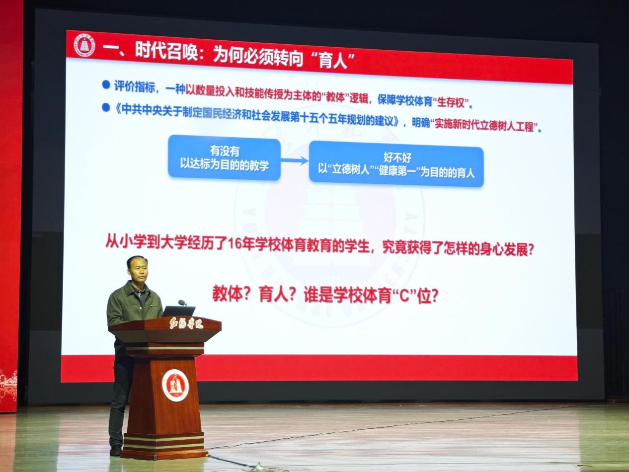 体育学院院长普春旺教授应邀作题为《从“教体”到“育人”——学校体育高质量发展的范式转换与路径创新》的主题报告。报告深刻剖析了当前学校体育发展的核心问题,提出了从单纯技能传授向全面育人转变的新范式,其前瞻性的观点和创新的实践路径引发了与会师生的深度思考和强烈共鸣。