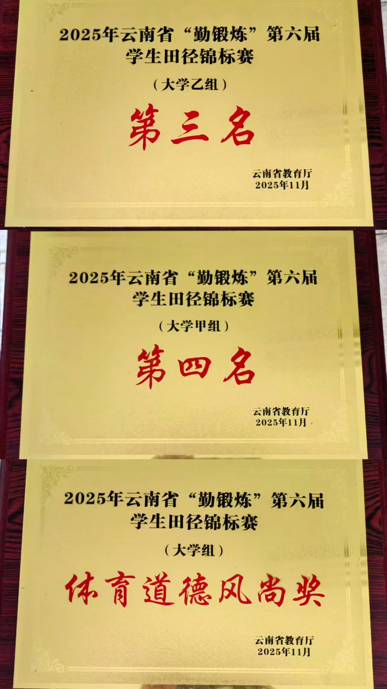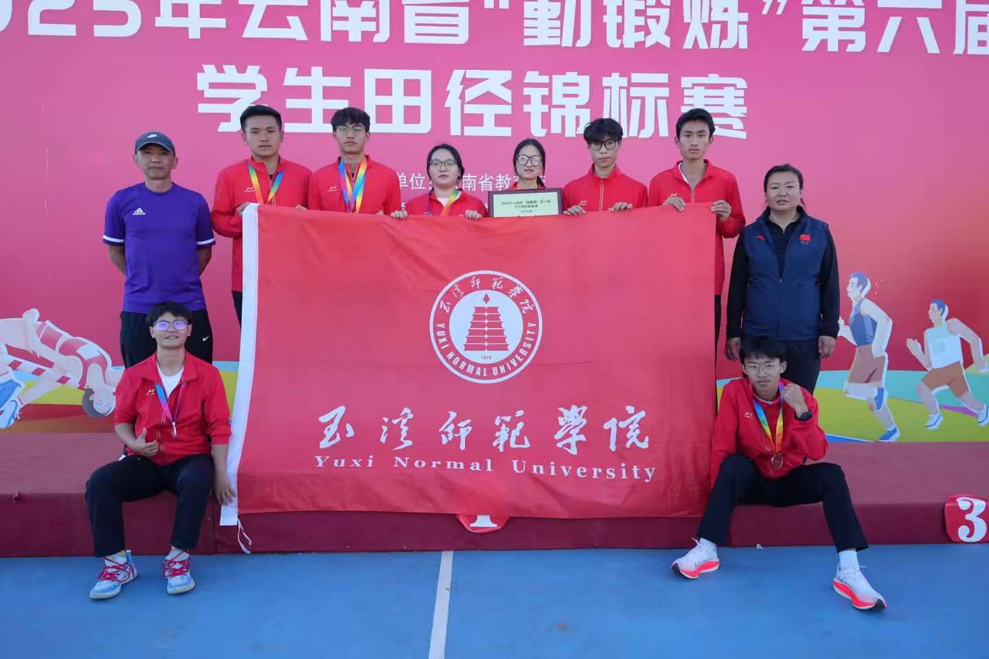 11月9日至13日,由云南省教育厅主办的2025年云南省“勤锻炼”第六届学生田径锦标赛在玉溪高原体育运动中心圆满落幕。玉溪师范学院学子在体育学院李学东、李俊恒、赵艳艳三位老师带领下,奋勇拼搏,共夺得11金、3银、5铜的优异成绩,并打破4项赛会纪录,充分展现了学校体育教育的丰硕成果和学生的良好精神风貌。
