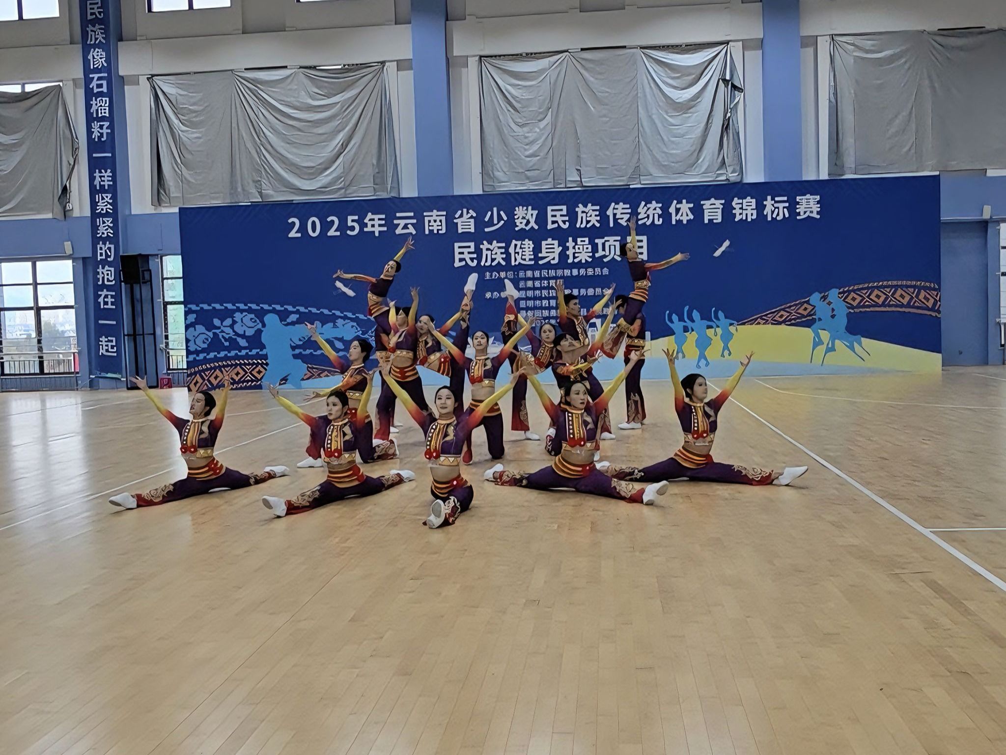 在民族健身操比赛中,玉溪师范学院代表队代表玉溪市出战,以精湛的技艺、富有创意的编排和极具感染力的舞台表现,赢得了评委和观众的一致好评,最终以总分第一的优异成绩,勇夺一等奖。