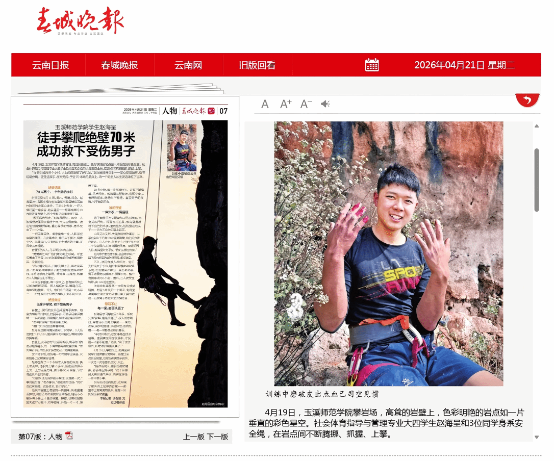 【春城晚报】玉溪师范学院学生赵海呈 徒手攀爬绝壁70米 成功救下受伤男子