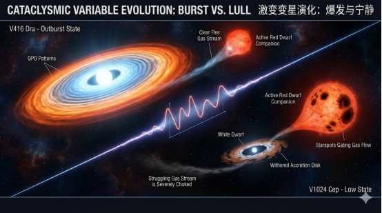 图2 通过对比爆发活跃的V416 Dra与因“恒星黑子”阻塞物质流而进入宁静低态的V1024 Cep,直观展示了恒星表面磁活动如何像“阀门”一样调控激变变星系统的能量演化。