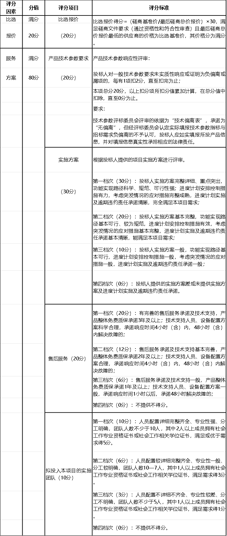 本次评审采用综合评分法。报价分值为20%,服务方案部分分值80%,要求全面响应服务内容和要求。