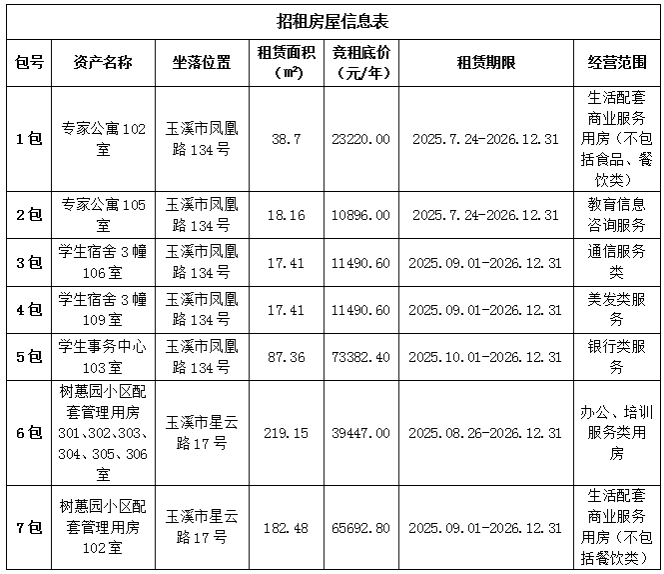 7包(副标题):玉溪师范学院2025年第四批对外出租房屋公开招租项目(7包)(树蕙园小区配套管理用房102室)